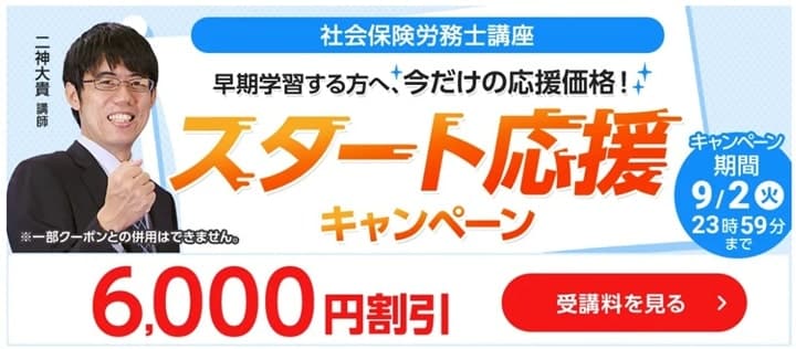 社労士合格コースの割引期間は9月30日(火)となってますが、無料講座登録の15%OFFクーポンは2025年08月31日(日)までと終わるのが1ヶ月早いので、受講をご検討中の方はお早めに!