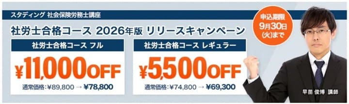 スタディングでは2026年度向け講座のリリースキャンペーンと題して、社労士合格コース フル/レギュラーを対象に大幅な割引キャンペーンが実施されております!
